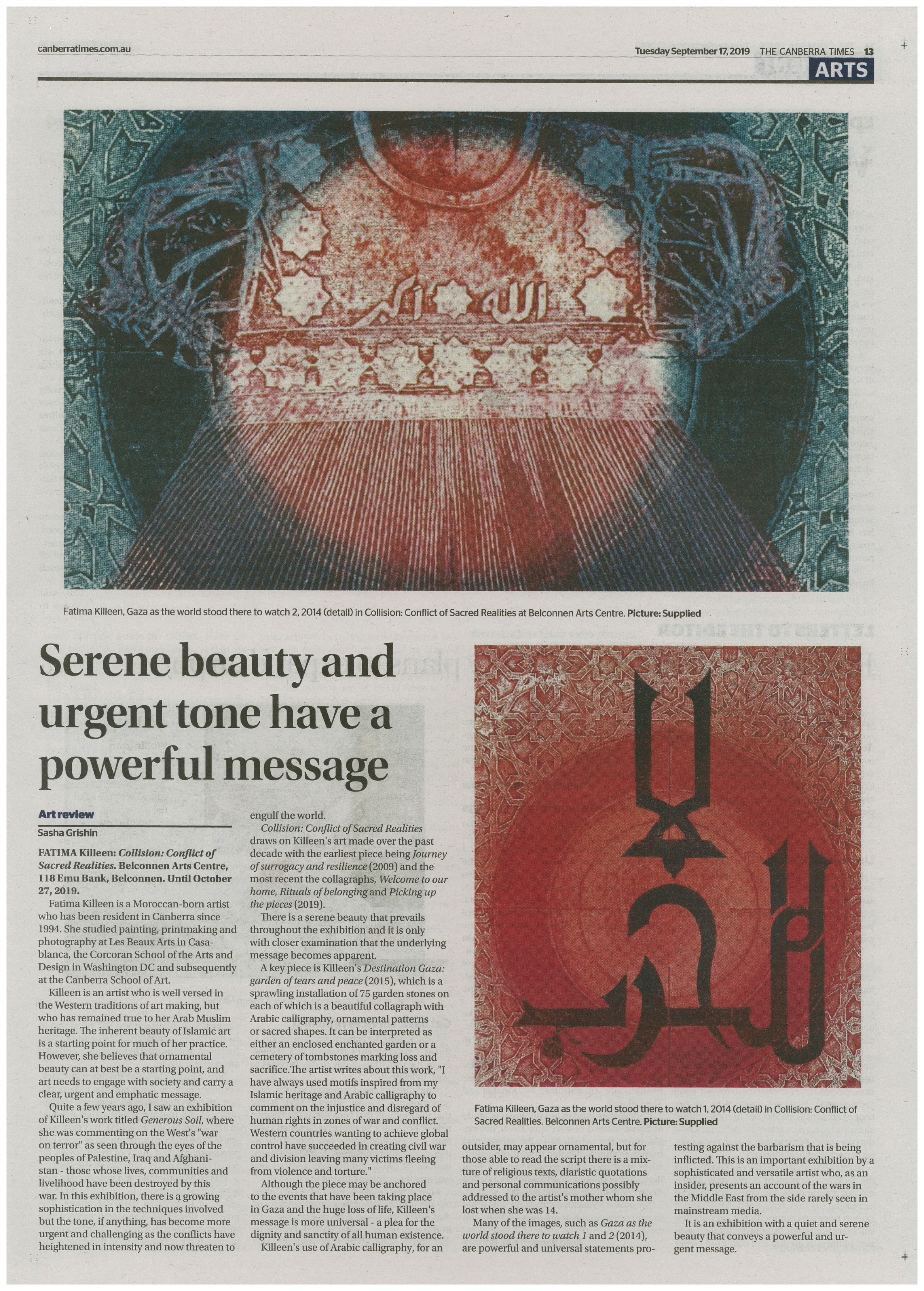 Fatima Killeen’s new solo exhibition is only a few days away and SBS Radio has aired an interview to discuss Collision – Conflict of Sacred Realities, opening at the Belconnen Arts Centre next week.