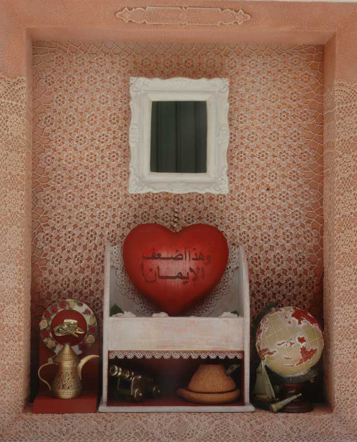 Lace, paper roses, acrylic, found objects, mirror, sand, wood