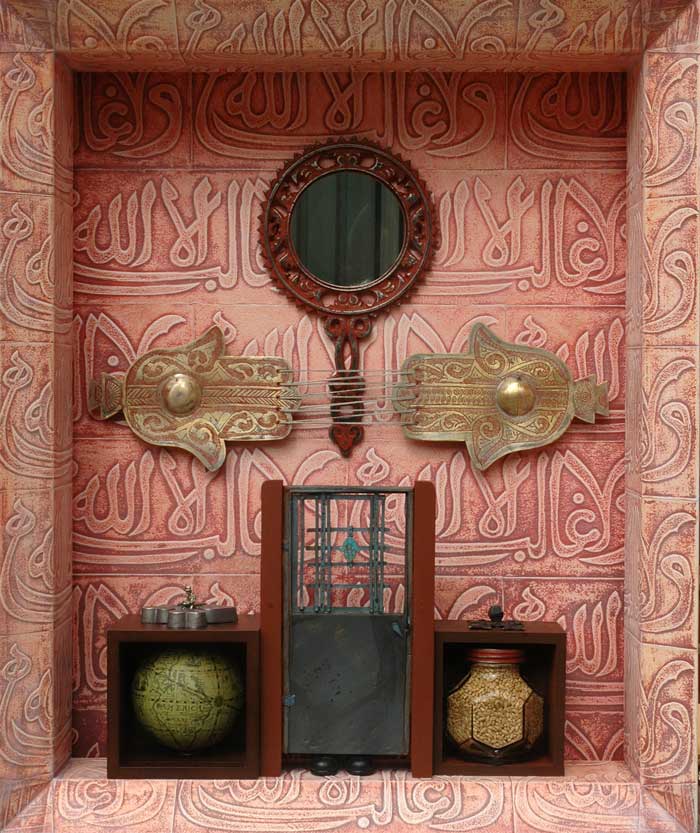 At the Friday prayer from a raised pulpit called the “minbar,” the congregation listens to sermons, proclamations and readings from the Koran performed by the Imam at the mosque. My construction of the minbar housing a loom within is an attempt to create a spiritual escape from the ruthlessness of war resulting from the materialistic world, and greed over who can own most of the Arab oil. Women in the war zone have taken charge of the burial of their husbands & sons, providing for their families and overseeing the well-being of their faith and spirituality.